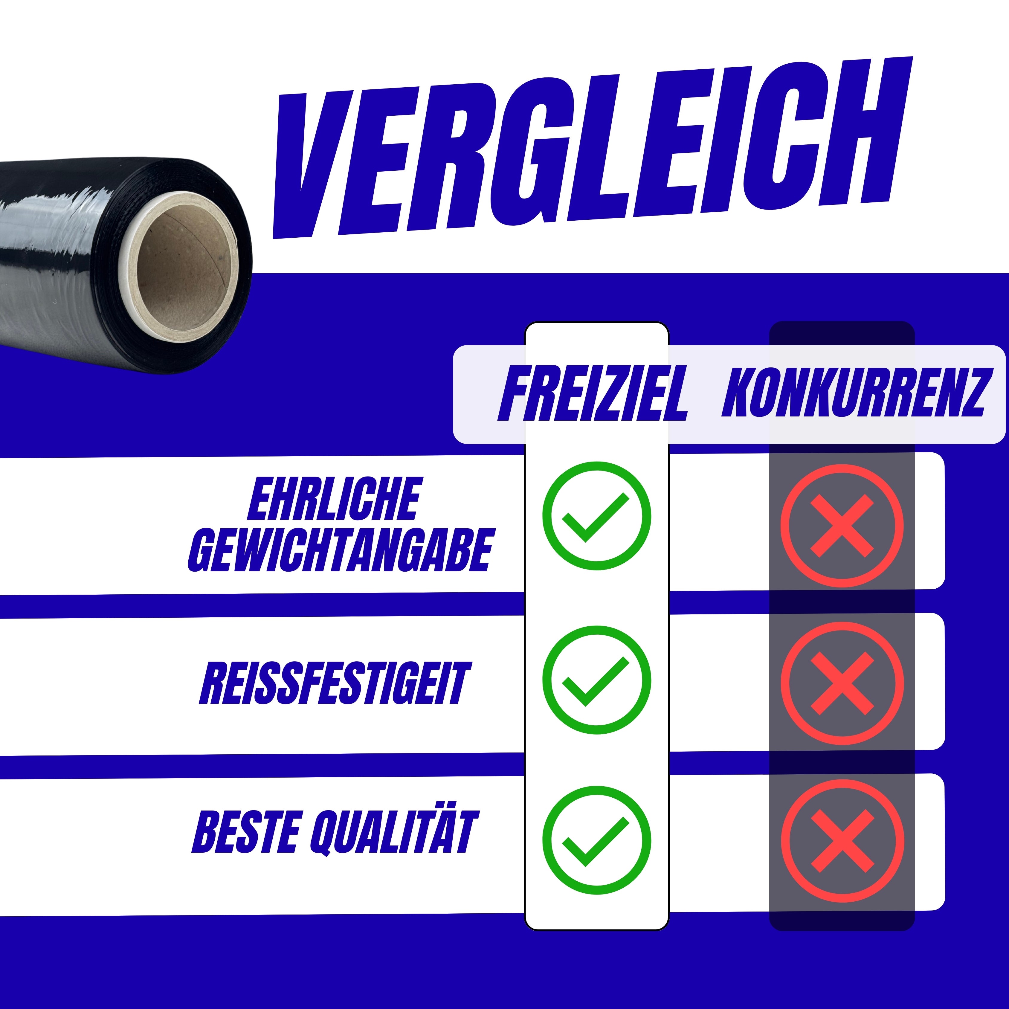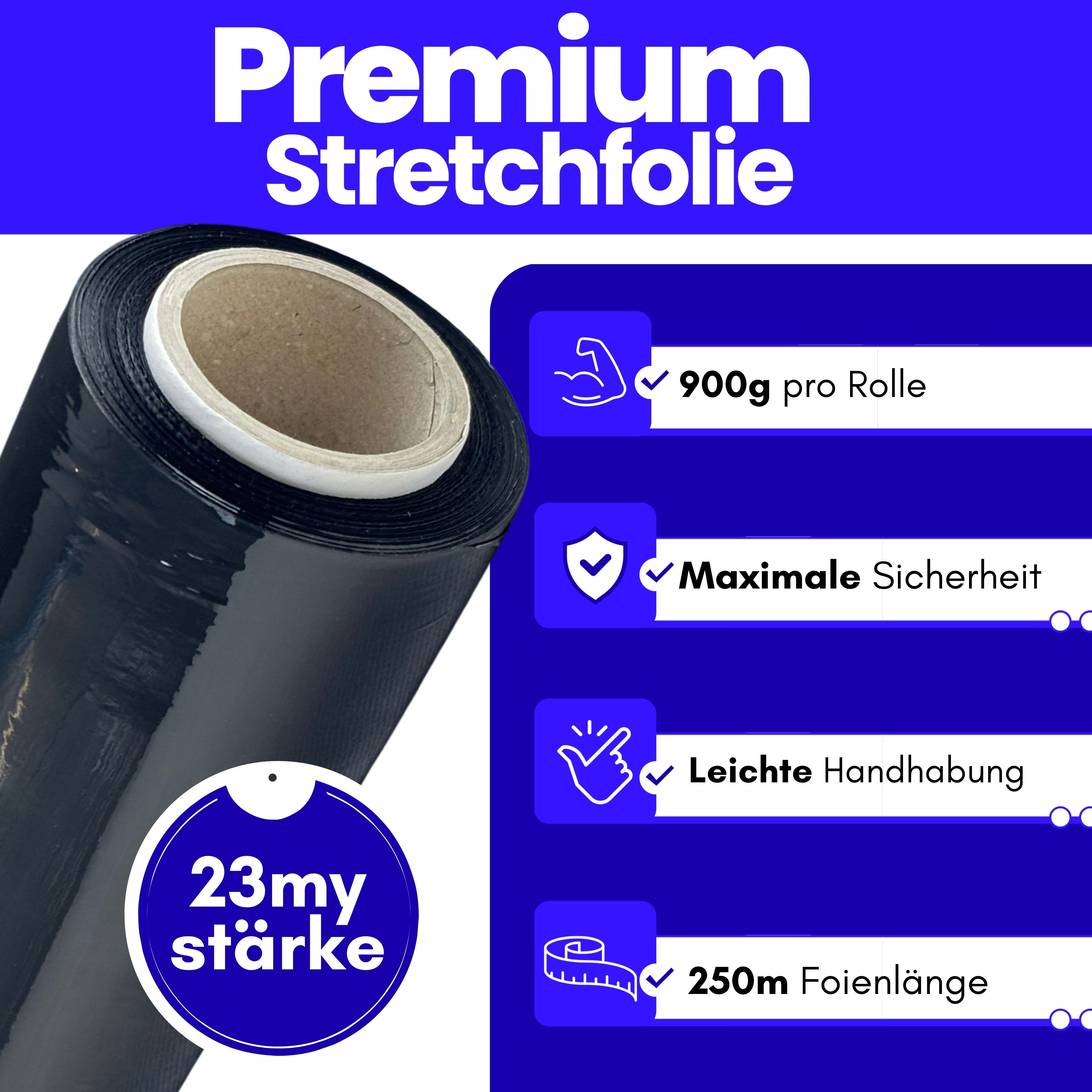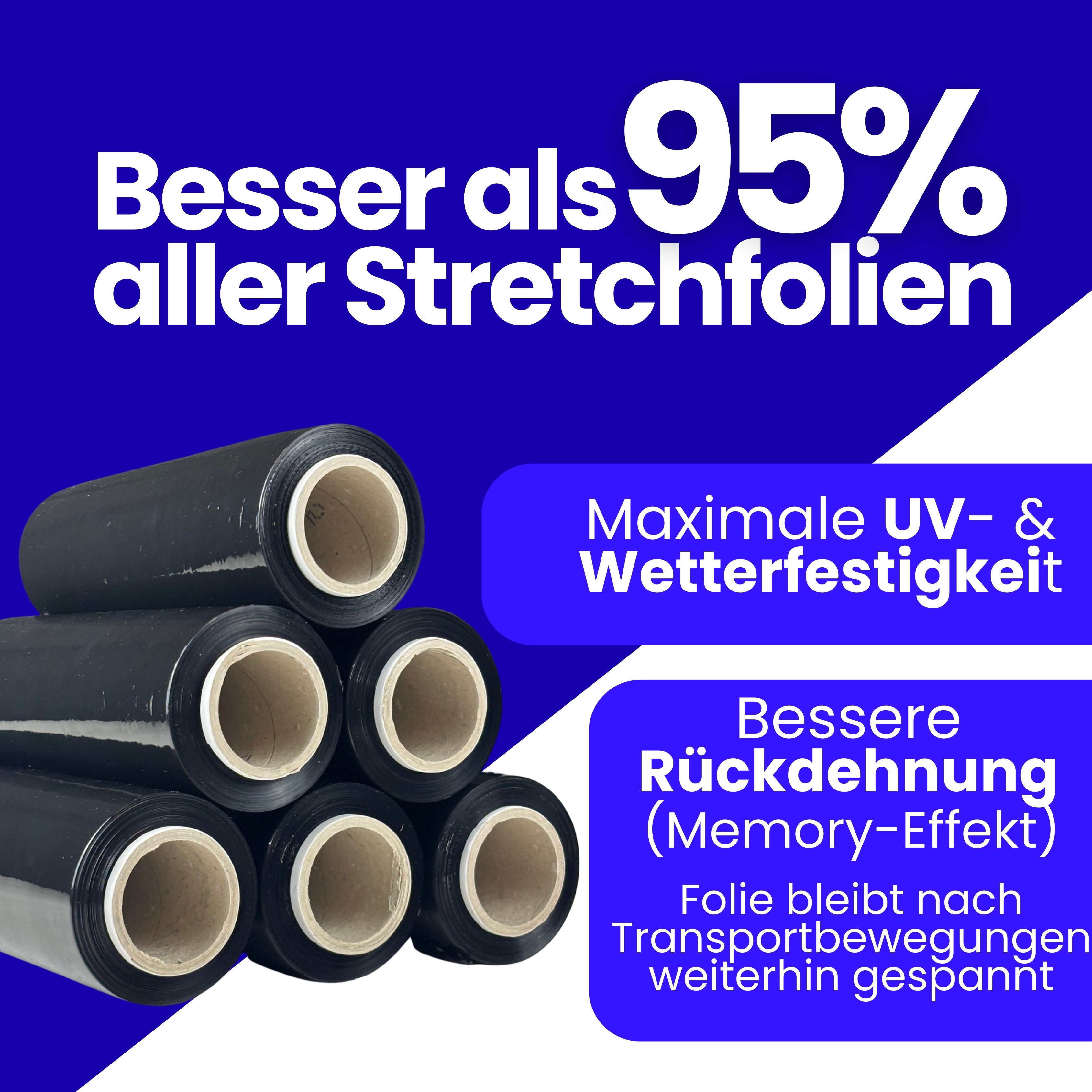 Premium Stretchfolie – Extra stark & effizient Unsere hochwertige Stretchfolie bietet maximale Sicherheit und einfache Handhabung. Mit einer Stärke von 23my, einer Folienlänge von 250 m und einem Gewicht von 900 g pro Rolle ist sie die ideale Lösung für Versand, Lagerung und Transport. Dank der 180 % Dehnungsfähigkeit holst du mehr aus jeder Rolle heraus: Ohne Dehnung: 150 m Leicht gedehnt: 233 m Mittel gedehnt: 294 m Stark gedehnt: 397 m Die bessere Rückdehnung (Memory-Effekt) sorgt dafür, dass deine Waren auch nach Transportbewegungen zuverlässig gespannt bleiben. Zudem ist die Folie UV- & wetterbeständig, hoch reißfest und auch mit Abroller verfügbar. ✔ Ehrliche Gewichtsangabe ✔ Maximale Sicherheit ✔ Beste Qualität für Profis