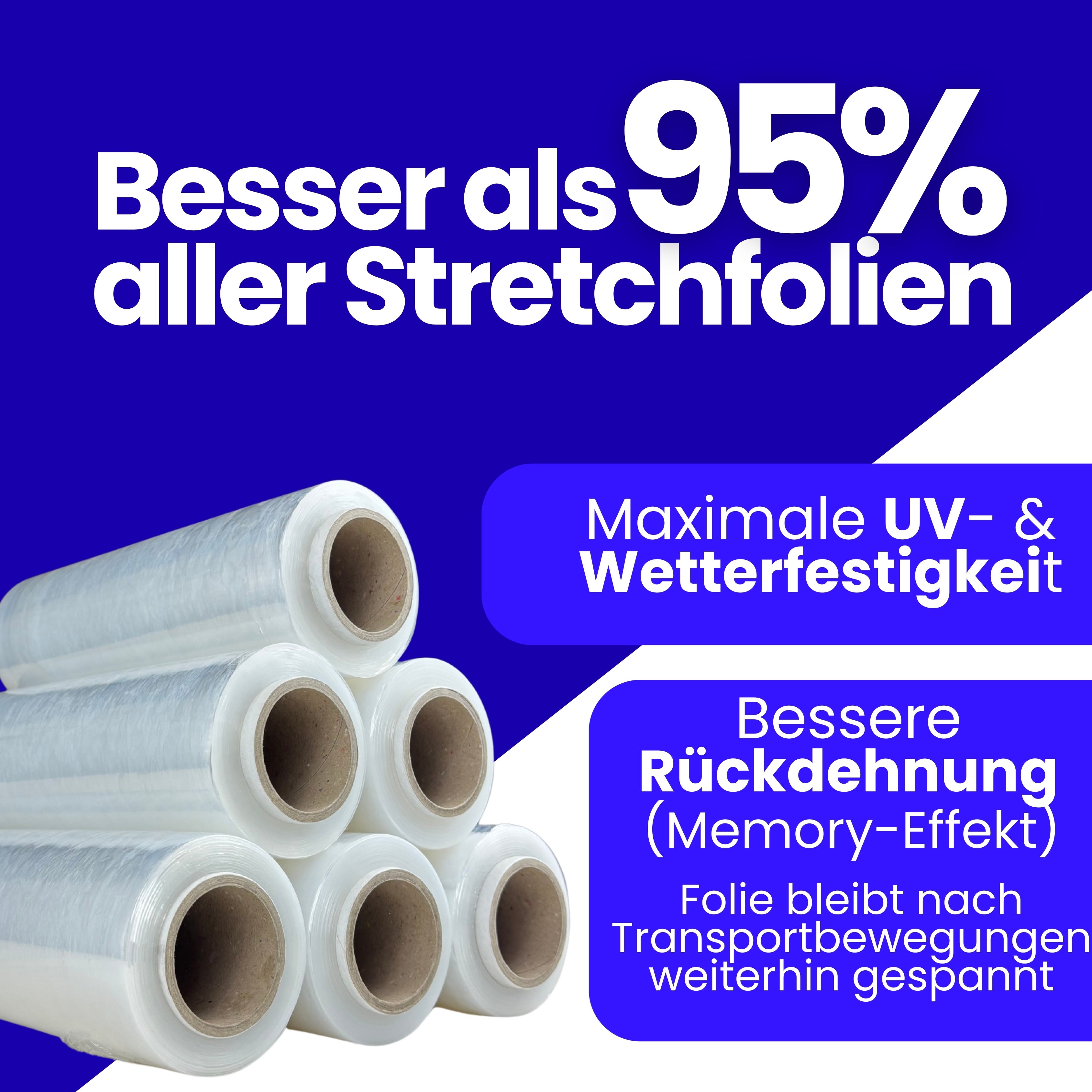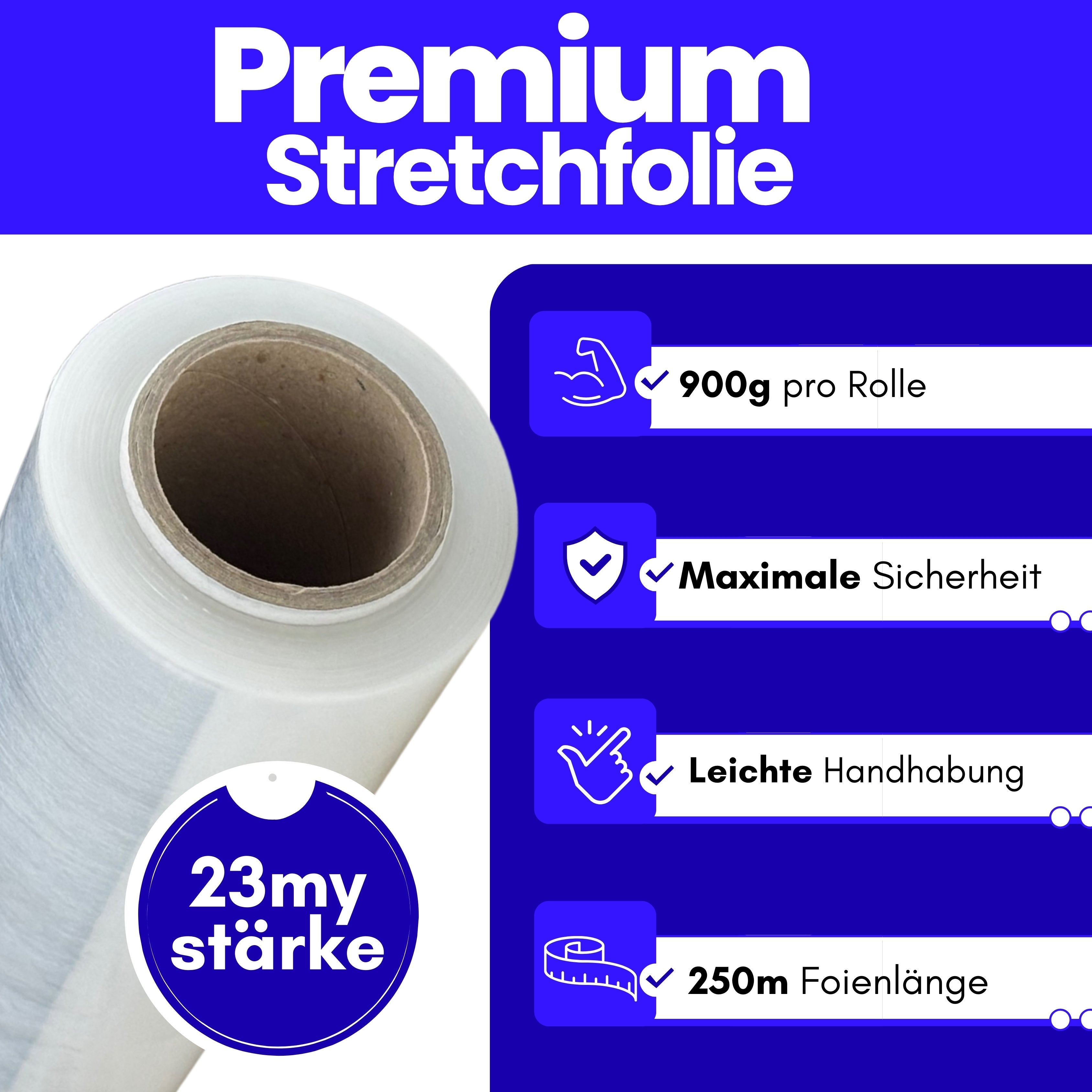 Premium Stretchfolie – Extra stark & effizient Unsere hochwertige Stretchfolie bietet maximale Sicherheit und einfache Handhabung. Mit einer Stärke von 23my, einer Folienlänge von 250 m und einem Gewicht von 900 g pro Rolle ist sie die ideale Lösung für Versand, Lagerung und Transport. Dank der 180 % Dehnungsfähigkeit holst du mehr aus jeder Rolle heraus: Ohne Dehnung: 150 m Leicht gedehnt: 233 m Mittel gedehnt: 294 m Stark gedehnt: 397 m Die bessere Rückdehnung (Memory-Effekt) sorgt dafür, dass deine Waren auch nach Transportbewegungen zuverlässig gespannt bleiben. Zudem ist die Folie UV- & wetterbeständig, hoch reißfest und auch mit Abroller verfügbar. ✔ Ehrliche Gewichtsangabe ✔ Maximale Sicherheit ✔ Beste Qualität für Profis