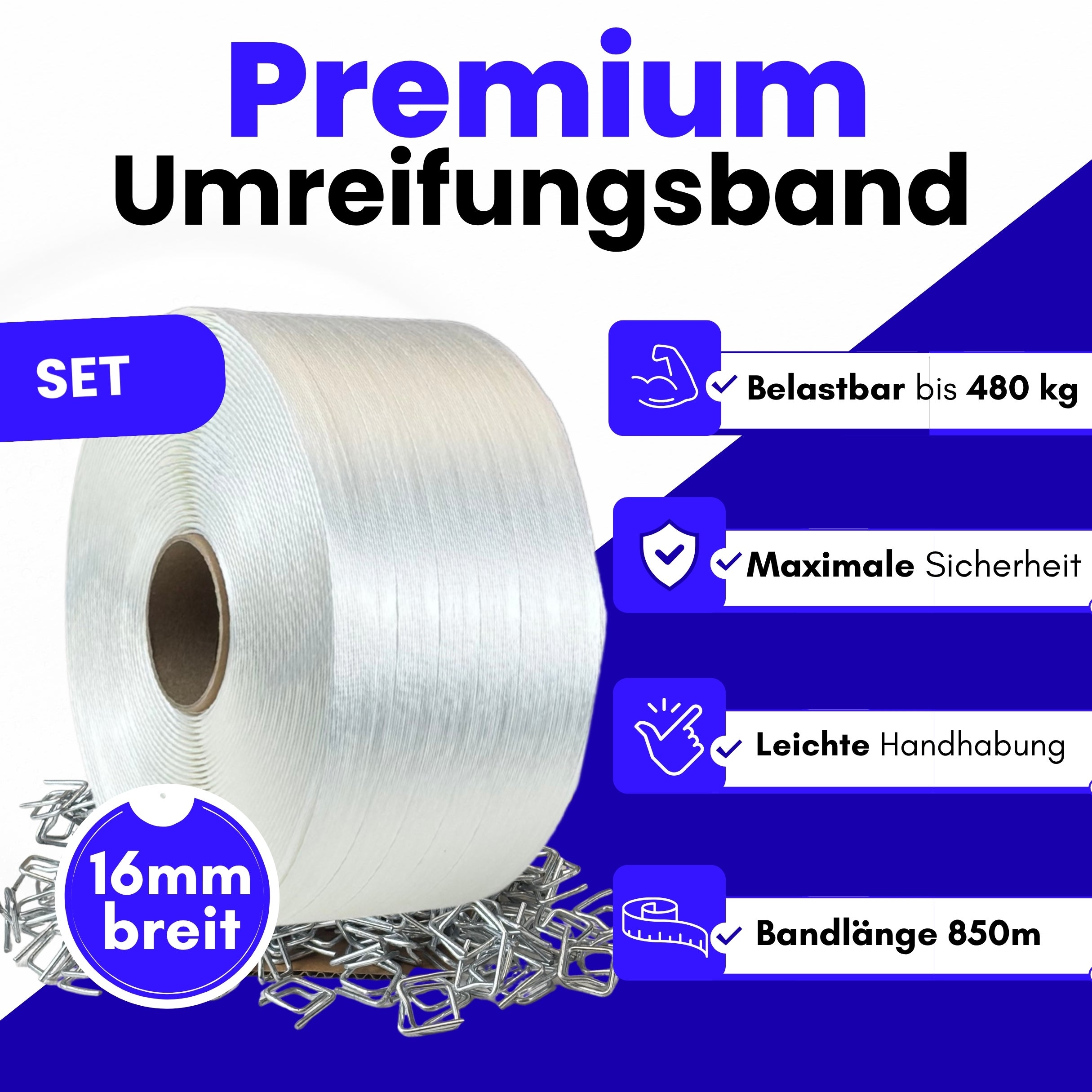 Freiziel® Umreifungsband Set | Polyesterband 16mm/850m + CB5 Verschlussklemmen | PET-Band Set für Transportsicherung und Verpackung | Premium Qualität